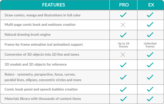 Includes all features of PRO version. Provides professional functions for manga, comics, webtoons, and unlimited frames for professional animations!